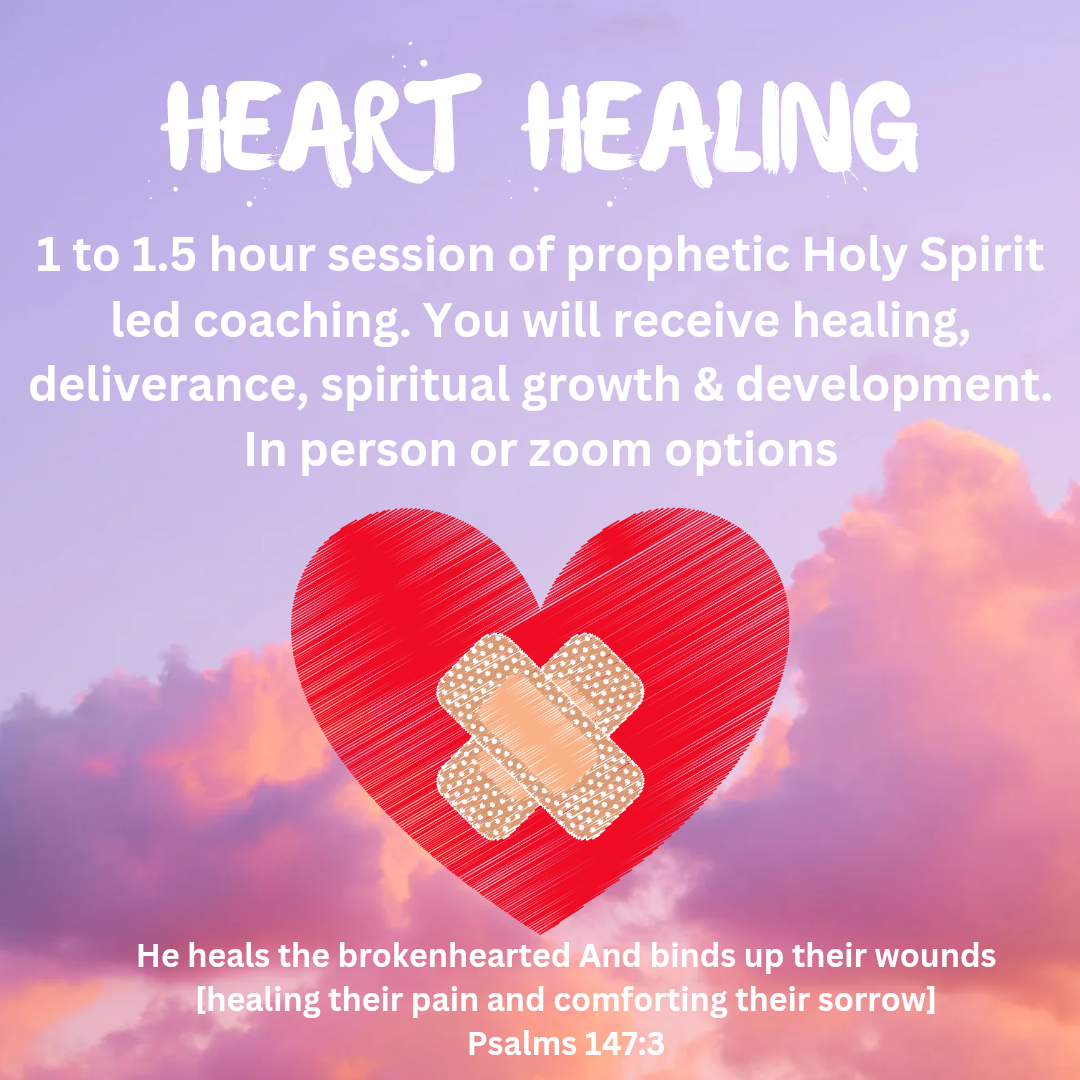 60 to 90 minutes of Holy Spirit led heart healing, spiritual life coaching/counseling & spiritual development. We will give this time to Jesus and watch Him powerfully move to heal and release breakthrough in your life.