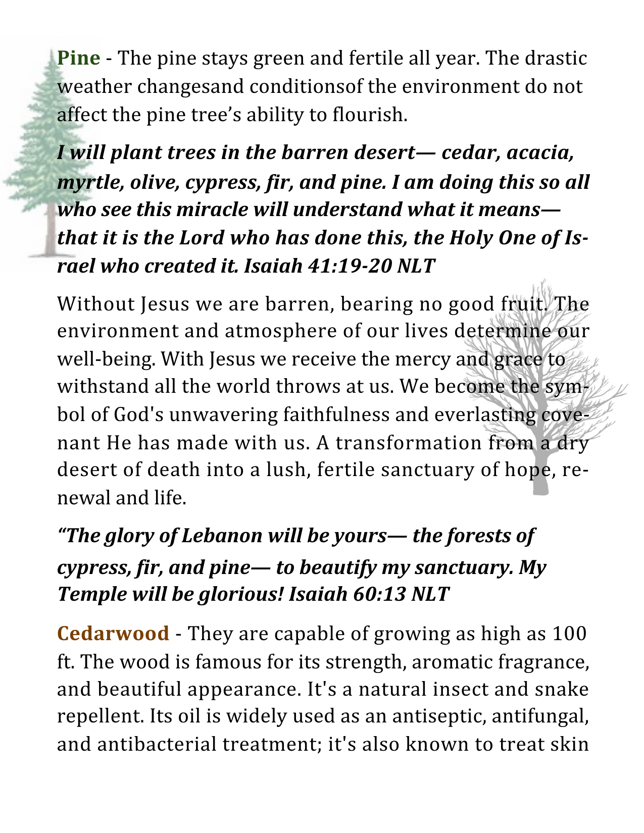 The Lord instructed me to make an oil using only the 3 woods that were used to make the crucifixion cross, which are believed to be cypress, cedarwood & pine. It's a very beautifuly calming yet fragrant scent that brings tears to my eyes when I remember everything Jesus has done for me & us. His mercy is so captivating & full of endless love.